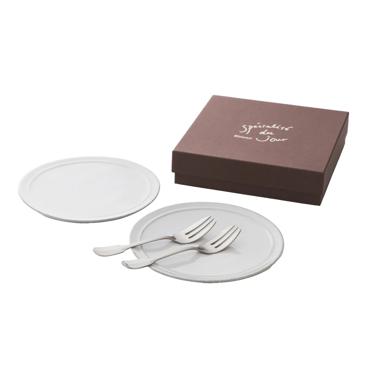 ナチュラルな風合いのケーキプレートとクラシカルなケーキフォークがペアになったギフトセット。