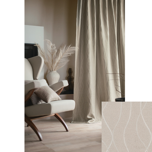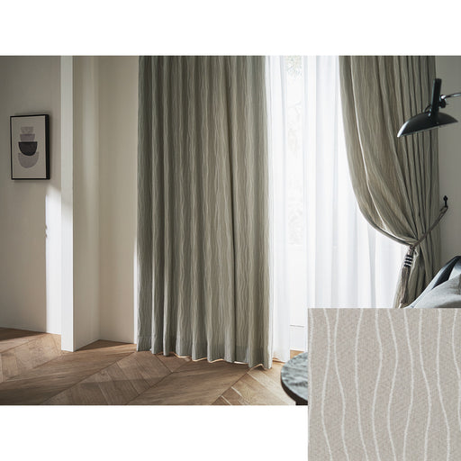 遮光2級 ウォッシャブル 形態安定加工 細いラインで表現したウエーブ柄の遮光商品。やわらかく流れる様はジャガード織ならでは。杢感のある糸を使用し、ナチュラルな空気感を演出。さり気ないデザイン性でどんなシーンにも合わせやすい人気商品です。 コーディネート画像(使用例)|カーテン:JE96...