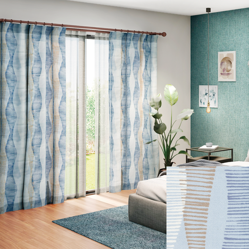 ウォッシャブル エコ 形態安定加工 ウェーブ柄が印象的なプリント商品。リサイクルポリエステルをベースクロスに使用したエコファブリックです。大胆なデザインで空間が華やぎ、日々が楽しくなるような北欧スタイルに。カラー無地と組み合わせたスタイルカーテンもおすすめです。 コーディネート画像(使...