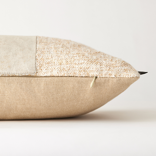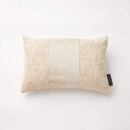 在庫品 通常配送 送料無料 中材別売り ブークレ生地の豊かなウェイト感と、ハラコ生地の上質なコントラストが魅力的。ハラコ生地に施されたゴールドのプリントは、控えめながらも輝きを放ち、このクッションの純粋で上品な表情をより際立たせます。程よいラフさはエレガントなテイストはもちろん、ナチュ...