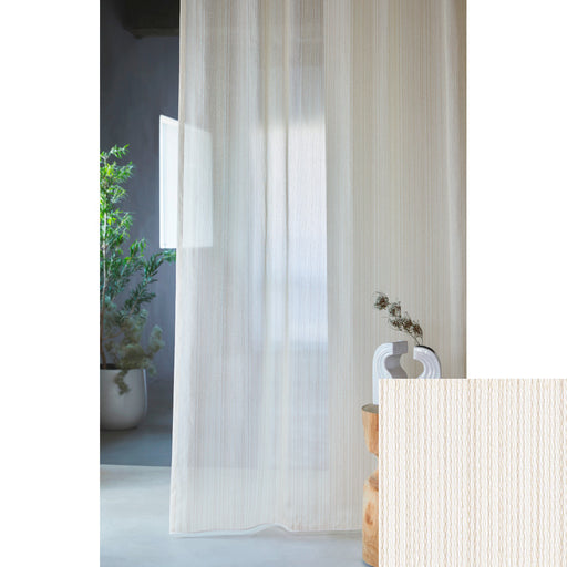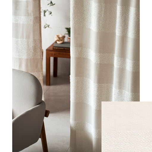 防炎 ウォッシャブル 形態安定加工 毛足の長い意匠糸を織り込んだボーダー柄レース。ほっこりとした糸の表情がかわいらしく、やわらかな雰囲気の仕上がりに。淡く染色したナチュラルカラーが軽やかで心地のいい空気感を漂わせます。 コーディネート画像(使用例)|カーテン:JD237 カラ...