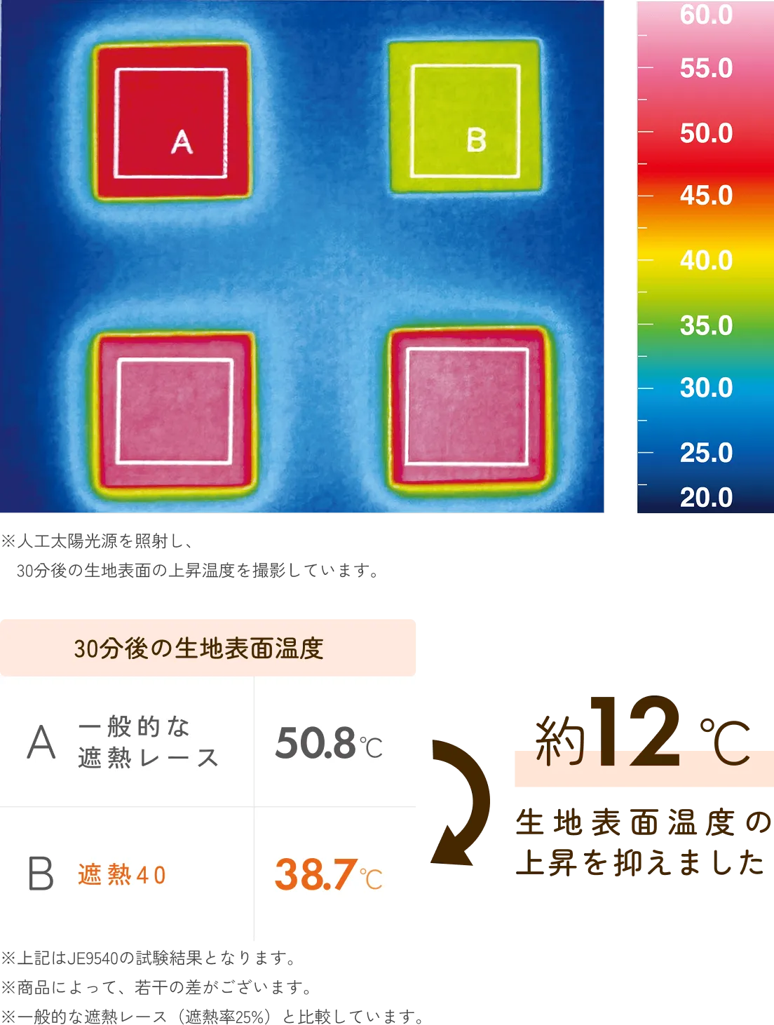 一般的な遮熱レースの約1.6~2倍にあたる「遮熱率40%以上」で、窓から入る熱と紫外線をブロック。