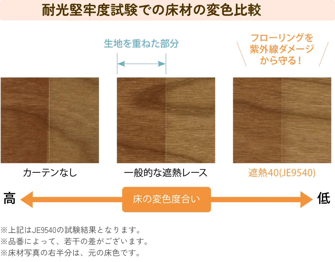 人工的な光源を20時間照射し、生地の違いによる床材の変色度合いを比較しました。一般的な遮熱レースよりも、床の変色度合いを大幅に抑えることができます。