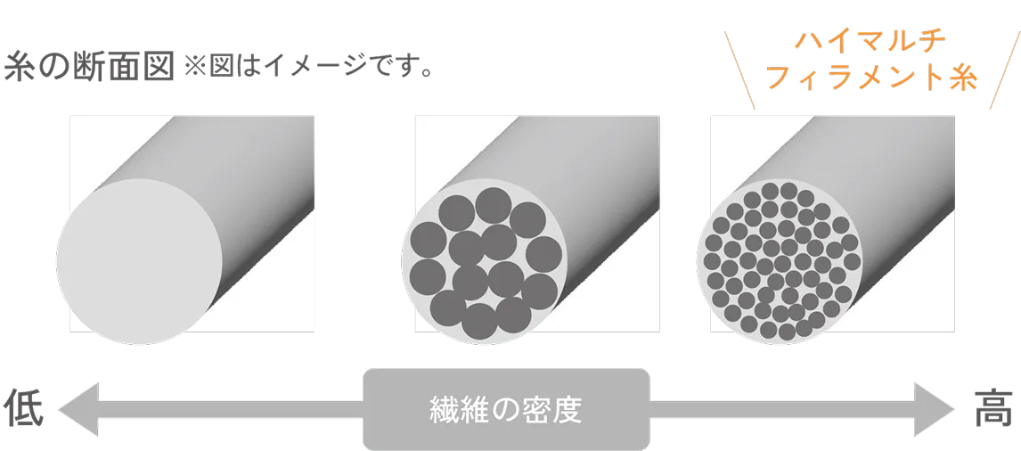 一本の糸を構成する繊維の数が多いため、繊維と繊維の隙間が少なく、生地の密度が高まります。