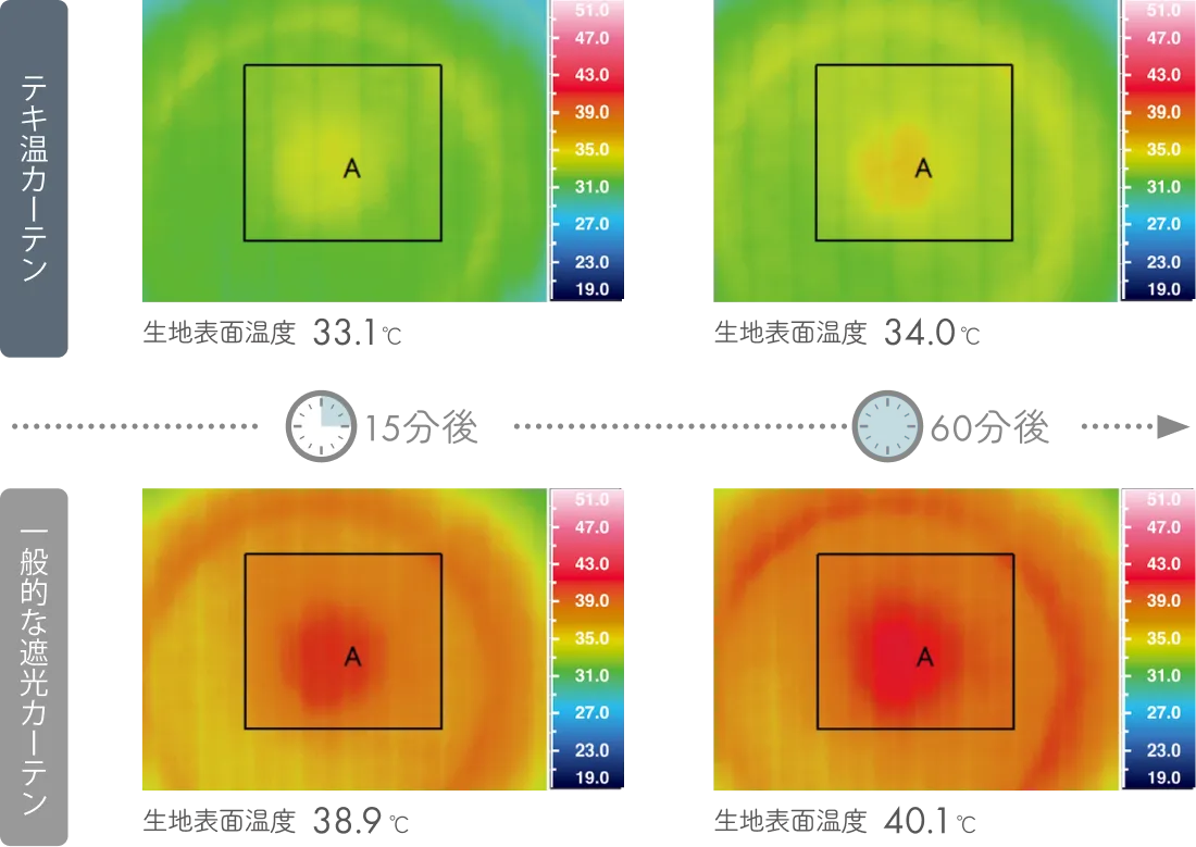 サーモグラフィーによる生地表面温度の比較でも、熱がこもりにくく、温度の変化が穏やかであることが証明されています。