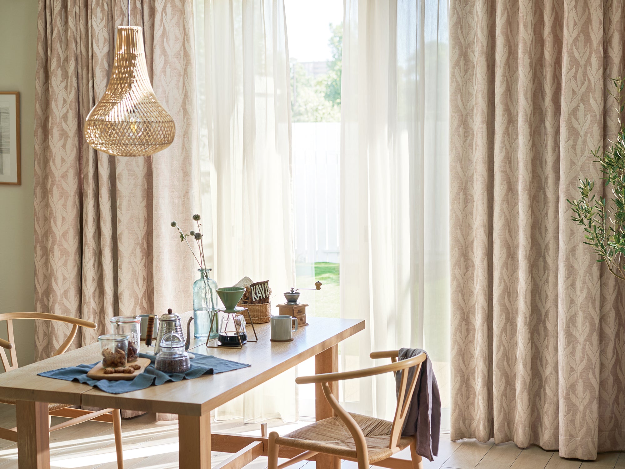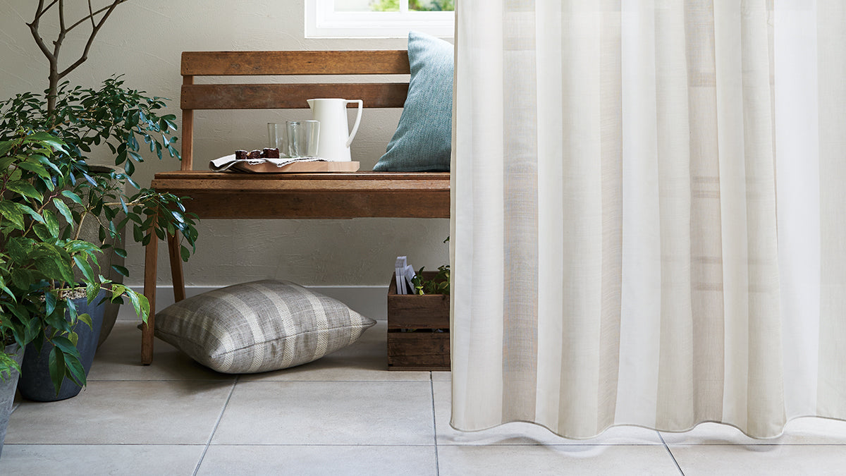 お家で洗濯ができる、天然繊維を使用したカーテンシリーズ。特殊な技術でリネンとポリエステルを複合し、天然繊維特有の収縮を抑えるジアスオリジナルの新素材です。